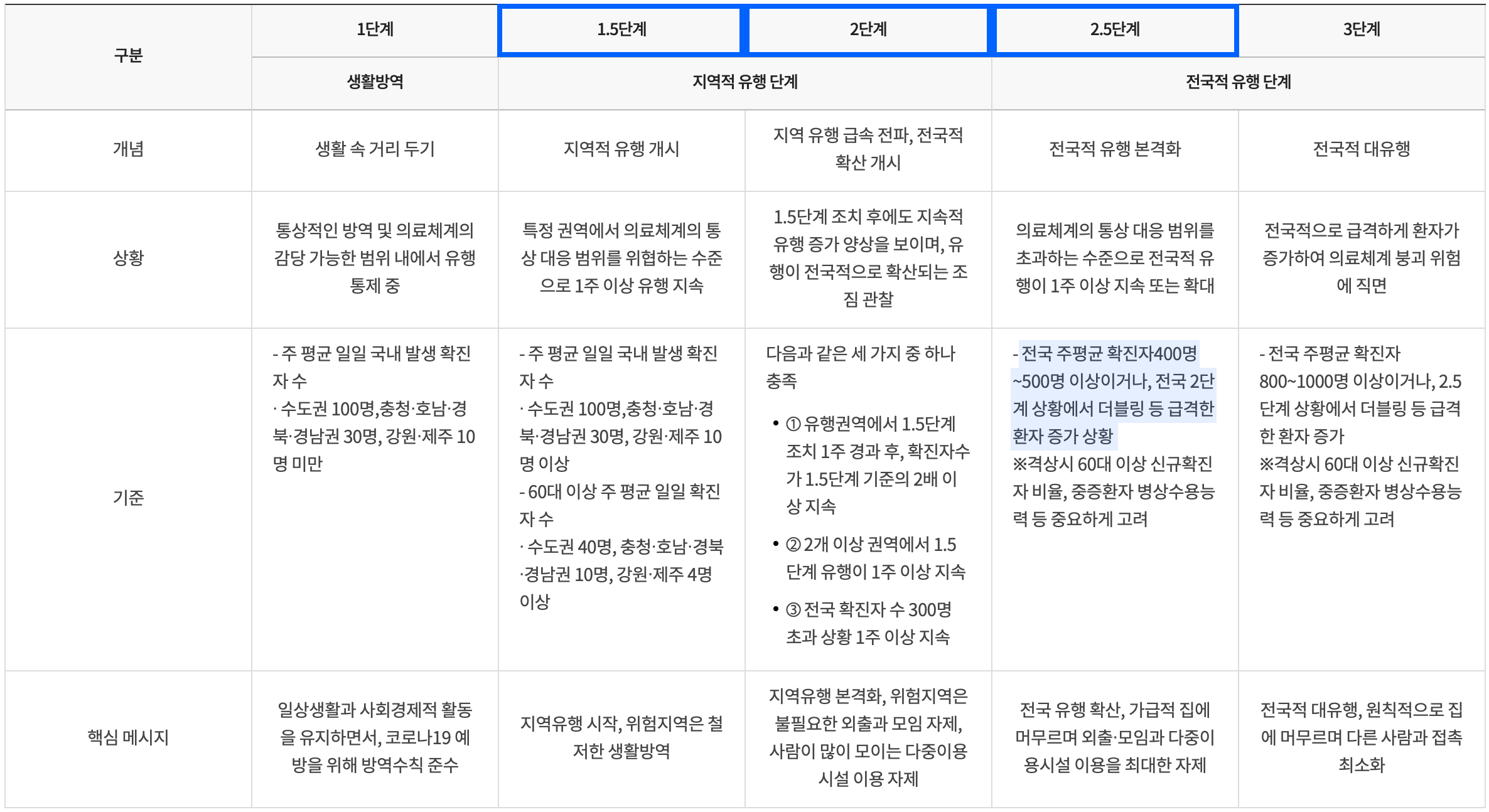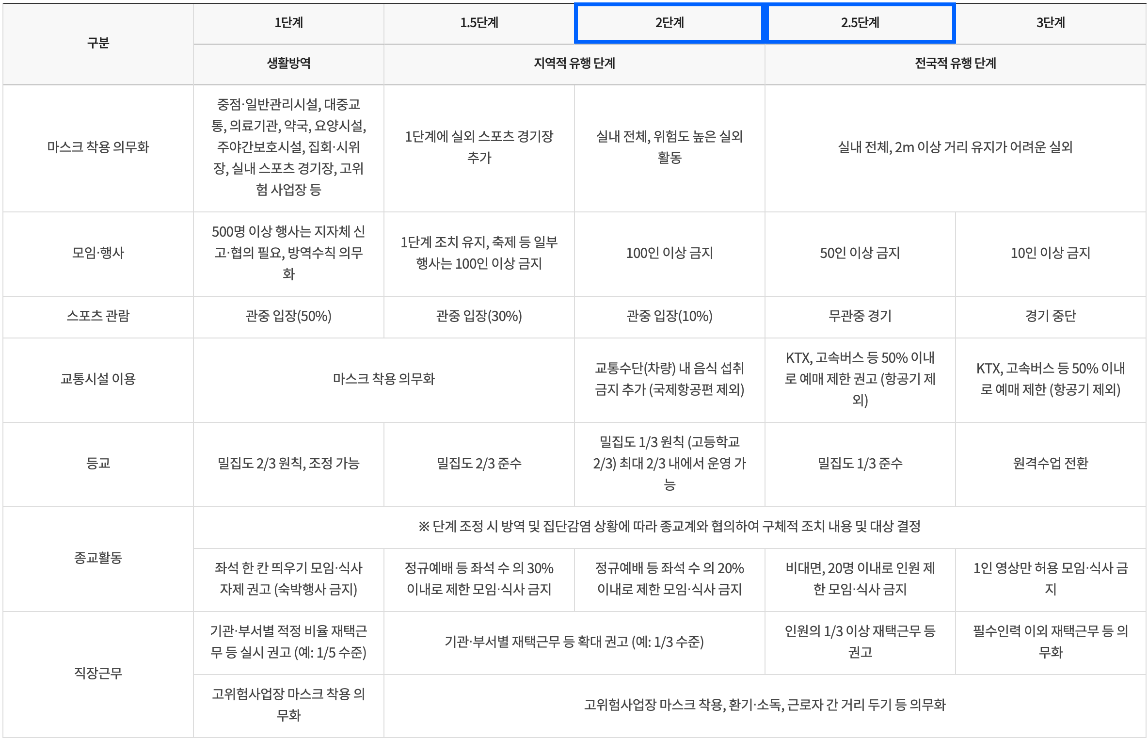 이처럼 또 다시 일상생활에 많은 변화를 가져오는 2.5단계로의 변화이기 때문에 혹시 계획했던 일이 단계 변화와 관련이 있다면 미리 어떻게 해당 시설﹒행사의 운영이 변할지 알아보시면 좋을 것 같습니다.
