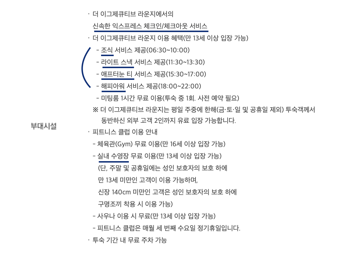 빠른 체크인/체크아웃, 실내 수영장/사우나/체육관 무료 등 다양한 항목이 있지만 뭐니 뭐니 해도 혜택의 꽃은 라운지 이용입니다.