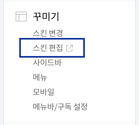 2. 페이지 이동 후, 왼쪽 하단에 위치한 [꾸미기]의 '스킨 편집'을 클릭해주세요.