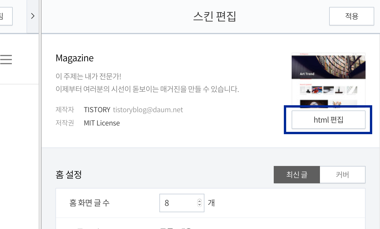 티스토리는 html, css를 통해서 세부적 설정을 변경 한다는 것을 들은 적이 있어서